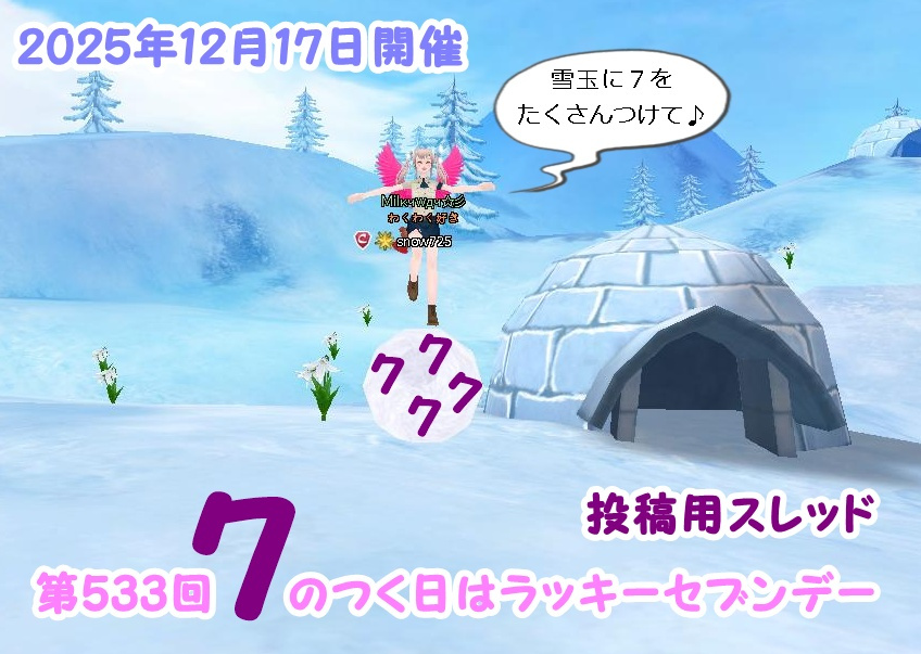 | 31028 | 【1月27日0時より8時59分まで】第537回7のつく日は... | snow725 | 2026/01/26 | 47 | 3/0 | ||||||||||||||
