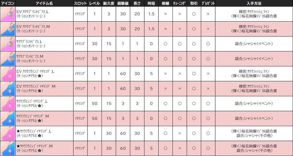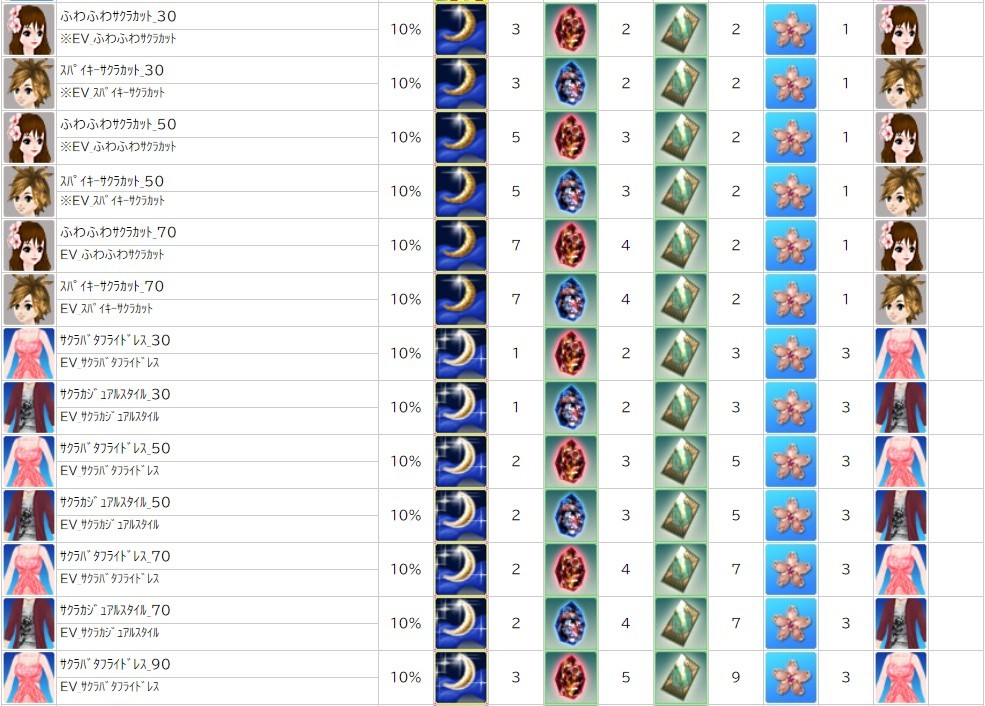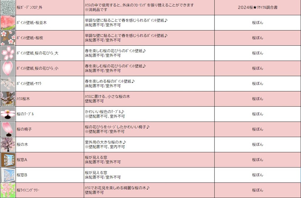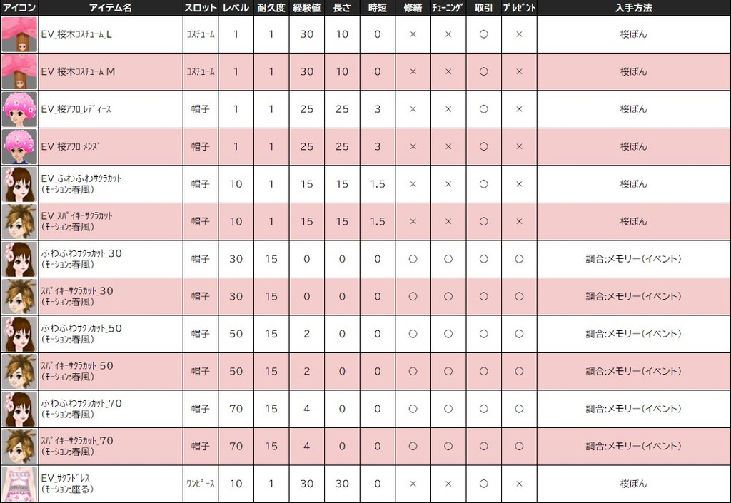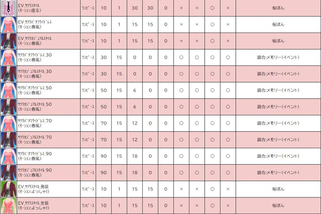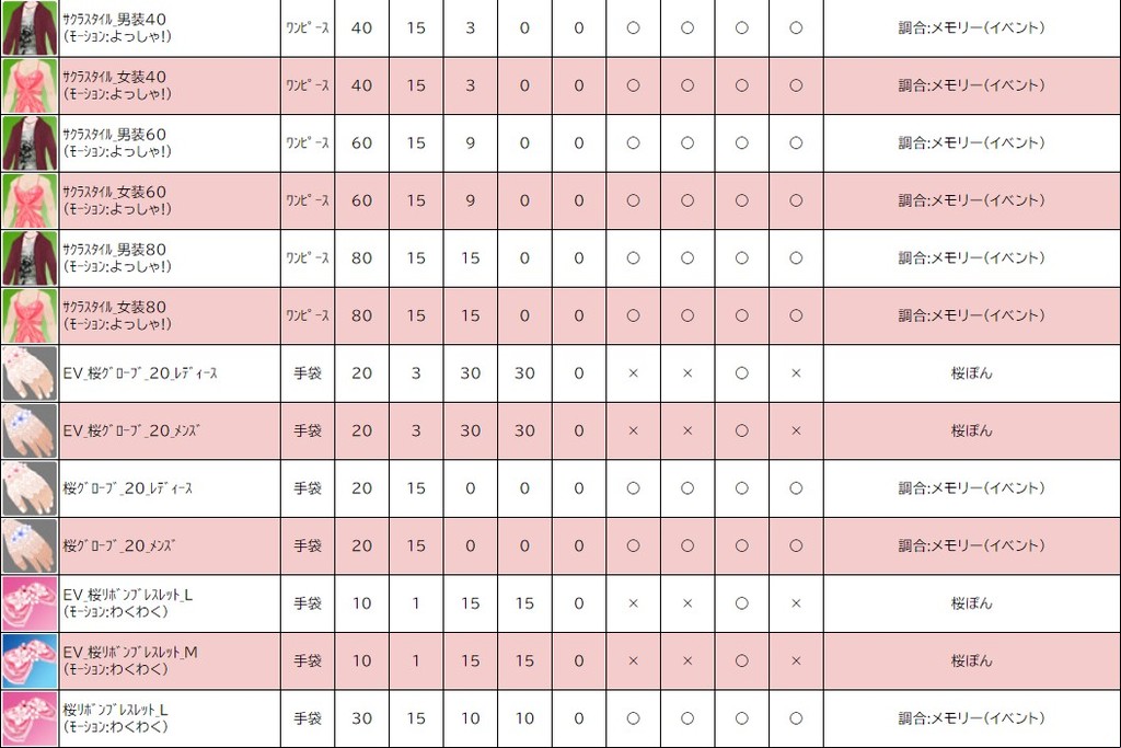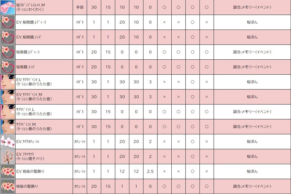各表は、クリックする事で拡大表示されます。○ 2024桜イベント ~ 1週目 ~ のアップデート告知はコチラ♪ ┗ https://www.milu.jp/news/notice_read.php?idx=26146