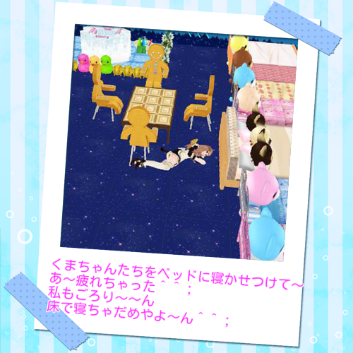 くまちゃんたちを寝かしつけて私もごろんとしようと思ったらあらら・・床に転がってました^^