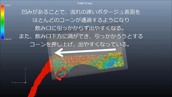 また、飲み口下方に渦ができ、引っかかろうとするコーンを押し下げ、出やすくなっている。