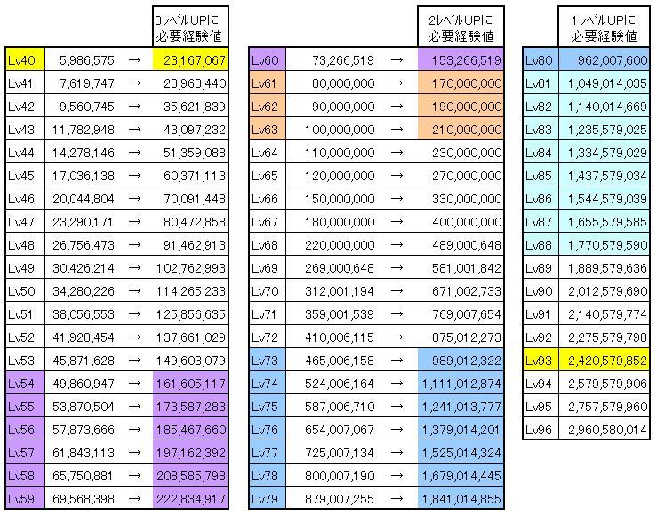 40 5,986,575 →3レベルUPに必要経験値は23,167,067、Lv93の人は2,420,579,852でLv40の人の