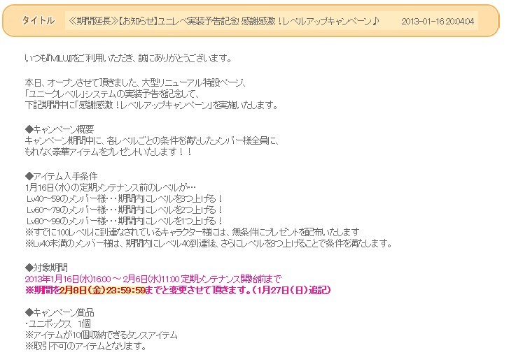 ユニレベ実装予告記念! 感謝感激!レベルアップキャンペーン♪は