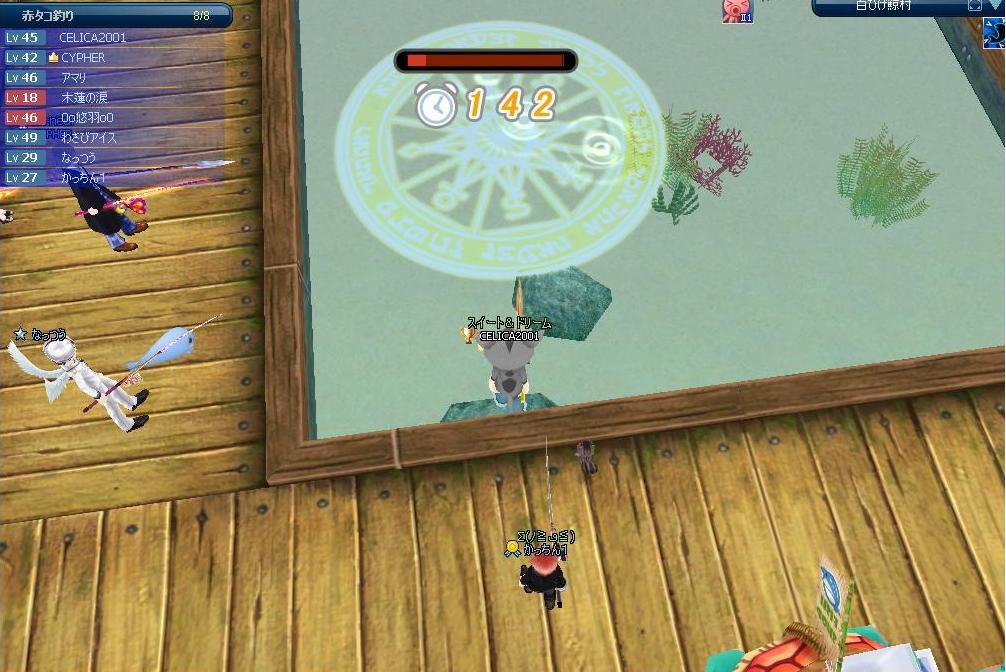 (タコ釣り場所が、イケスでやっていたため「茹でタコ」本体は遥か上空の気球にのかってて見えず、しかも参加者の殆どは疲れがたまってたりでまったりしてたのか、ほぼ全員がボスに気付かず><必死だったのは一部だけだったみたい・・・)