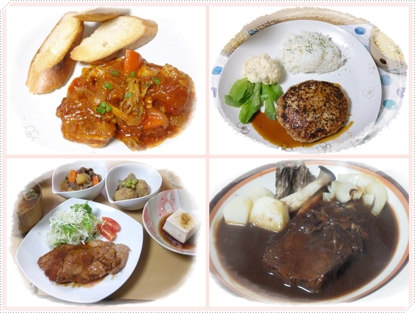 左下は、先日友人が来た時のお昼ごはん(豚肉の生姜焼き・肉じゃが・里芋の煮っころがし・柚子冷奴)。