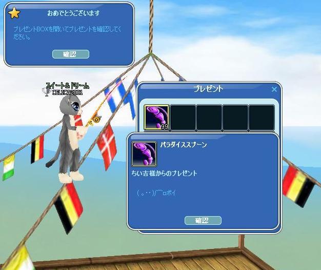 MILUトモの「ちい吉」さんからの贈り物で ( *´艸`) チーム対抗③「マボ24H」でAチーム優勝の貢献ができた様です ┏O)) アザ━━━━━━━ス!でした♪「イ憂 月券」賞品の「プラチナ・スプーン」204個 ゲ──(σ・∀・)σ──ツ!! です(≧▽≦)ゞ