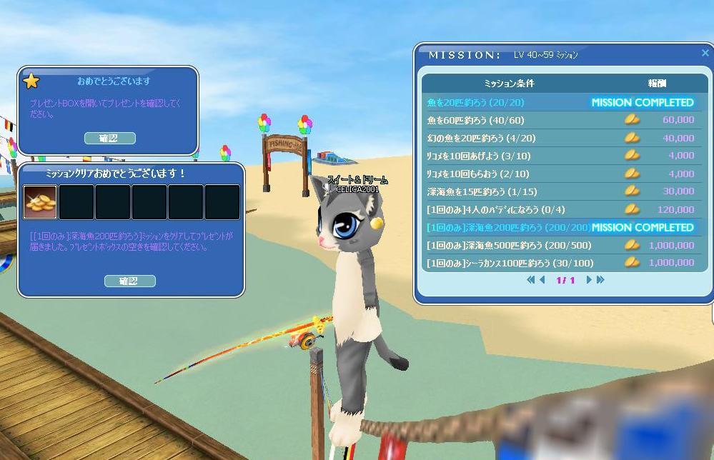 Lv40になってからの、「マボ」「深海」を除くでいりー・みっそん以外をクリアでけました(≧▽≦)ゞ (*´-д-)フゥ-3 ナンとか「深海魚」200匹吊り上げられたけれど・・・まだ、300匹釣らなきゃなんないし「シーラカンス」もまだまだ30匹だから・・・先は長いね(;-ω-)ゞ