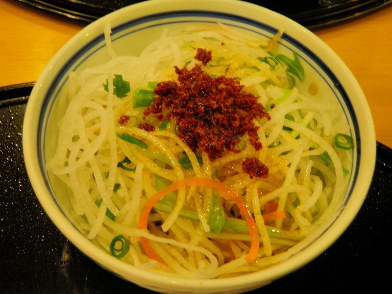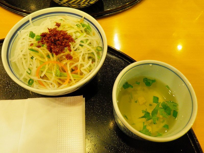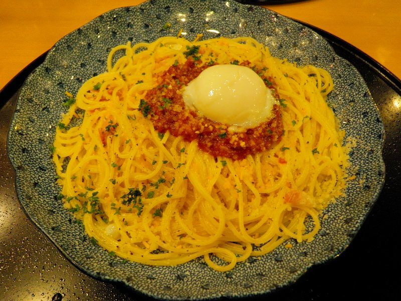 夕食は「洋麺」・・・ 釜揚げパスタのちぇーん店「五右衛門」で「カルボナーラ+ミートソース温玉載せ」「大根のサラダ」「スープ」にデザートの「富士りんごのキャラメルソースケーキ+バニラアイス載せ」でした♪