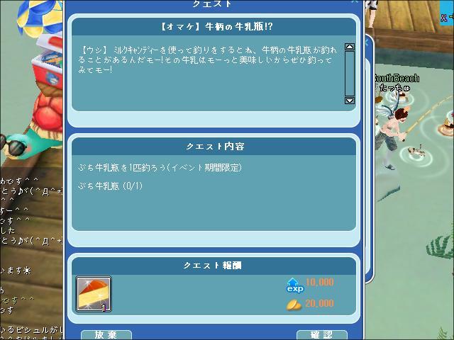 クエストでイベ餌釣ってイベ服手に入れて着ています。今度はホワイトデーのみならず牛と牛乳ののイベントですね。おまけまでクエスト勧めました。ピンクの牛乳瓶は最初は2つ釣れたけど子のクエストの時はなかなか釣れません。イベ服のエモーションでごろ寝をしてみました。