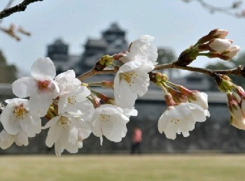熊本城二の丸広場で咲き始めたソメイヨシノ。奥は天守閣 (SS熊本日日新聞より