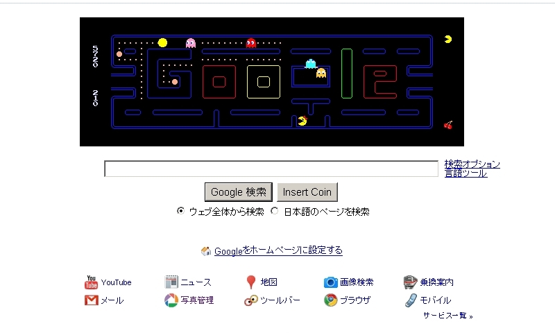 検索ボックスの下にある [Insert Coin] を押すか、しばらくまっているとゲームが自動でスタートします。キーボードの上下左右の矢印で操作できます迷路内をクリックしても遊べるようですw