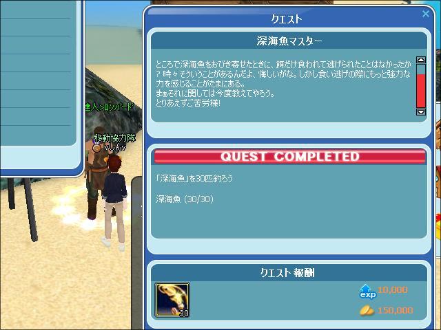 深海魚30匹クエスト完了です(`・ω・´)シャキーン 15マン、ゴチソウサマ