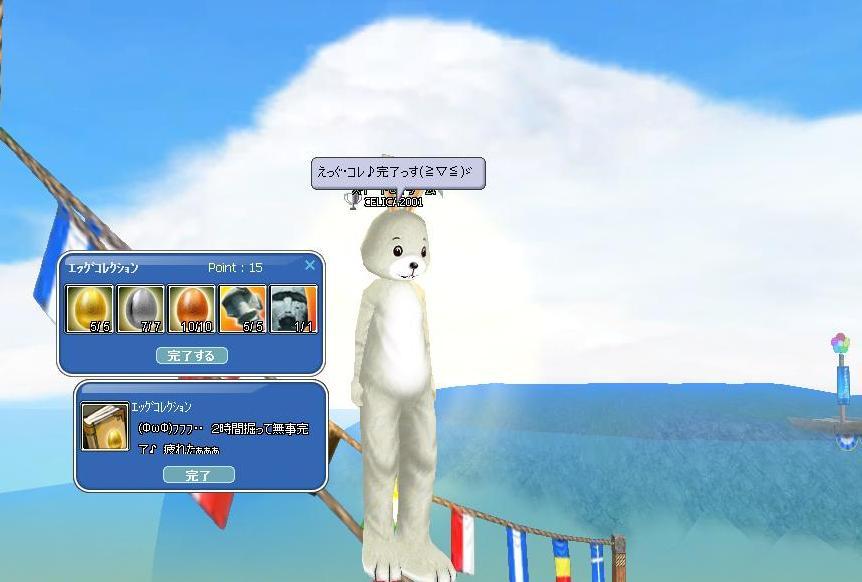 金曜のイベ王♪ 釣れたサイズは知っていたけど無理っぽいなって流してたんでしゅが・・・イベサメ《BIG部門》に4位で引っ掛かってたぁぁぁ コレで今月追加の2Ptとカード1枚を(σ゚д゚)σゲッツ そして、クエストと共にイースターイベントの「エッグ・コレクション」コンプリートっしゅ(≧▽≦)ゞ 見慣れぬたまご男(ハンプティ・パンプティ)なる「タマゴ男爵」が突っ立ってたんで、ウサ着でメンチ切っといたぁぁぁ Ψ( ̄∀ ̄)Ψケケケ
