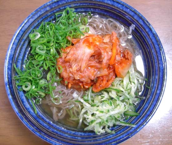 キュウリの細切りと刻みネギと牛角のキムチのせて食べました