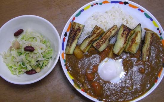 軟骨入りポークカレー・なす温玉トッピングとキャベツ・キュウリ・新玉ネギ・ビーンズのサラダ