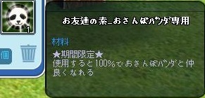 パンダぽんでパンダの餌が出たので、1個持ってた相方にポイしたら、パンダ素調合に成功して売ったGのお裾分けを頂いたり♪