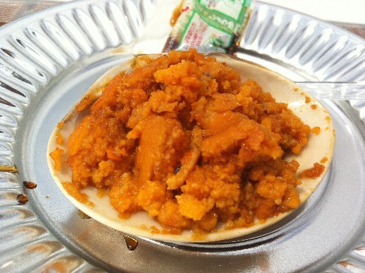 福島 かに船「うにの貝焼き」700円。