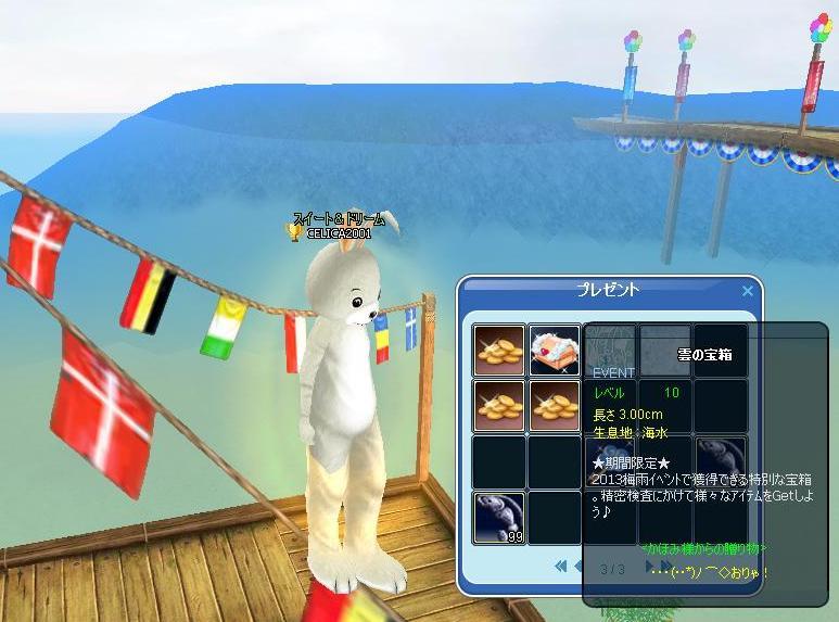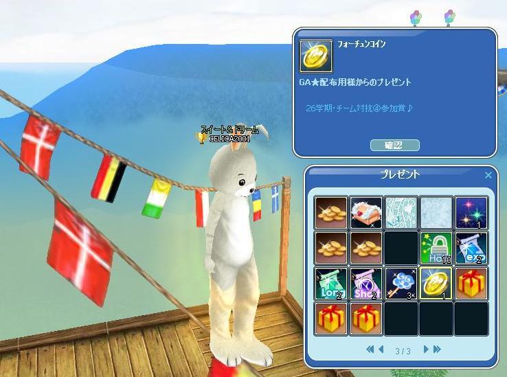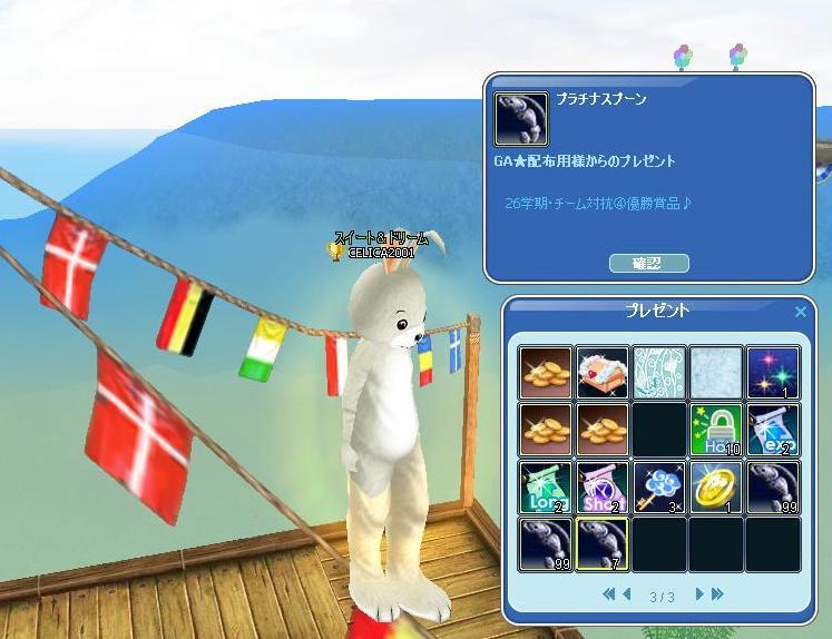 火曜日に実施された「チーム対抗④深海24H」も僅差ながらチームCが勝利(≧▽≦)ゞ★1位★:Cチーム 4,507匹 平均 13.17匹 342名のメンバー参加 Aチームはあと1匹ずつ、Bチームはあと2匹ずつ釣れていれば 今回はかなりの接戦でした!ギリギリ優勝!! 2位との差はほぼありませんっ\(◎o◎)/! プラチナスプーン×205匹をお贈りします゚+。(o'д'ノノ゙☆パチパチパチ。+゚★2位★:Aチーム 4,056匹 平均 12.55匹 323名のメンバー参加★3位★:Bチーム 4,091匹 平均 11.49匹 356名のメンバー参加 今回のチーム対抗は、「マボ24H」も「深海24H」もデイリーみっそんクリアだけじゃぁ、平均釣果に行くか行かないかなのでチョッチ頑張った結果・・・どちらも、平均釣果を越して記録できたのでチームC勝利に貢献できて一安心した(≧▽≦)ゞそして、ミルトモさん達からの頂きモノ各種♪ 日記クイズ等楽しい催しに参加したご褒美(o´・ω-)b ネッ♪
