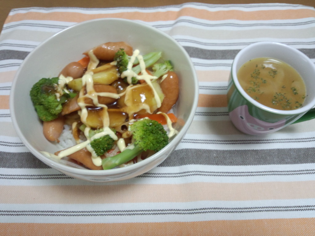 野菜たっぷりウインナーの甘辛丼 と オニオンスープ