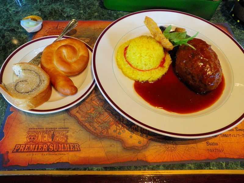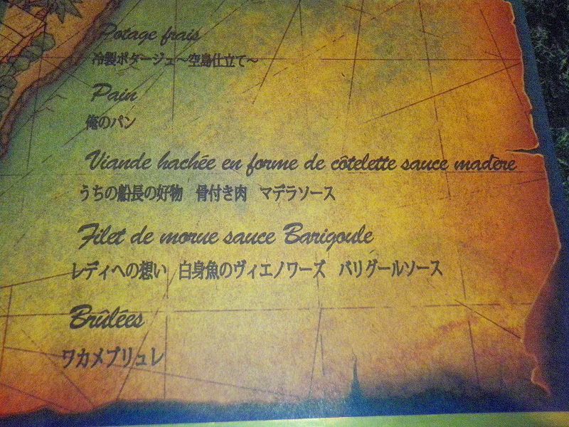 プレミア・サマーに行ってのランチは「サンジの海賊レストラン」で「海賊フレンチ」をチョイス うちの船長の好物 骨付き肉 マデラソース 骨付鶏肉とゆで卵をひき肉で巻いて焼いてあるみたい・・・ 美味しかったぁぁでも麦わらのターメリックライスはパンも有ってお腹一杯になる組み合わせ次回は、愛情フレンチの「魚」料理も試さないと(o´・ω-)b ネッ♪ 勿論、料理以外のスペシャルドリンクもオーダしちゃったし・・・