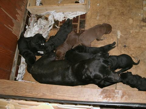 (子供たちは立っている母犬からもオッパイをせがむようになりました、母犬のお尻の辺りの泥は、脱走のなごり)