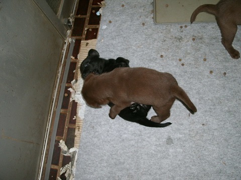 離乳食をあげている間は母犬は外に出していますが、食べ終わった頃入れてあげると、離乳食ぐらいでは足りないチビ達がワラワラと母犬に群がってお乳を飲み始めます。お母さん、身動きもままならず大変そうです。