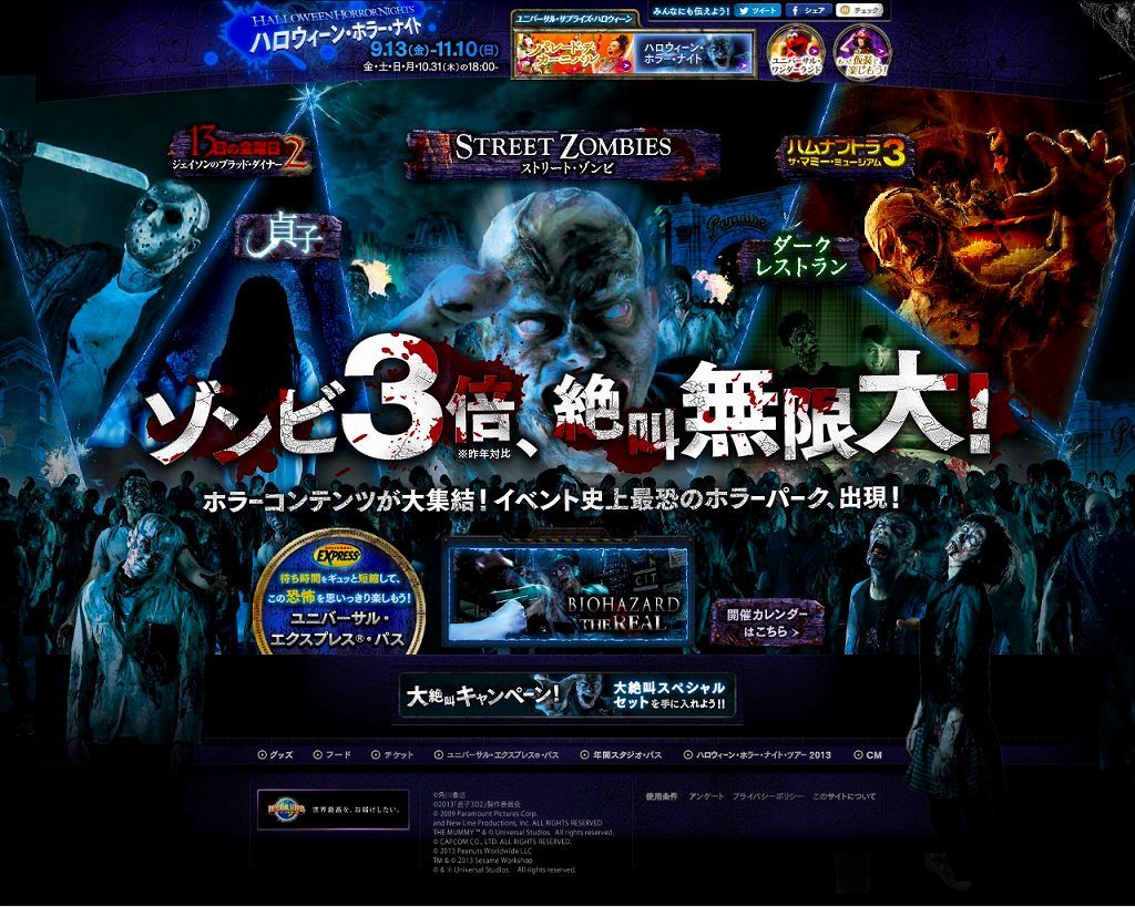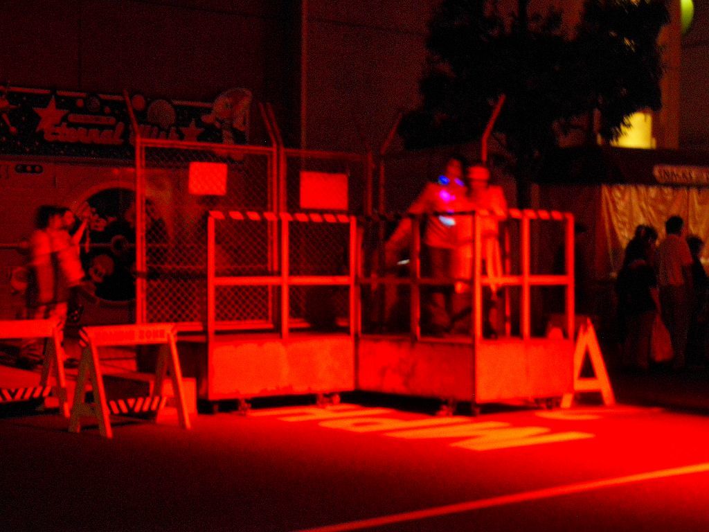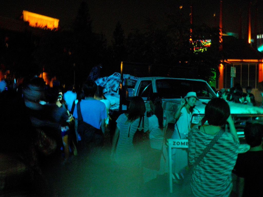 しかも、初日から曜日限定(2年前から始まった)「Horror Night」開催日が、奇しくもメインアトラクションのひとつ「ジェイソン」のメインタイトルって・・・ヒェε=Σ(`д´;ノ)ノ 先行体験会での画像(本当は、開催前の体験会なので撮影不可だったんだけど・・・) 取材クルーが、TVカメラ以外にスチルカメラを使ってたりするし、中盤以降は参加者も携帯でパシャパシャやってるのを見て、じっと我慢して指示を守ってるのが馬鹿らしくなって後半は撮っちゃった(´ω`;) ってコトで、普段なら人が写り込まないお店のオブジェは撮れないので貴重な画像を どぞぉぉ(≧▽≦)ゞ
