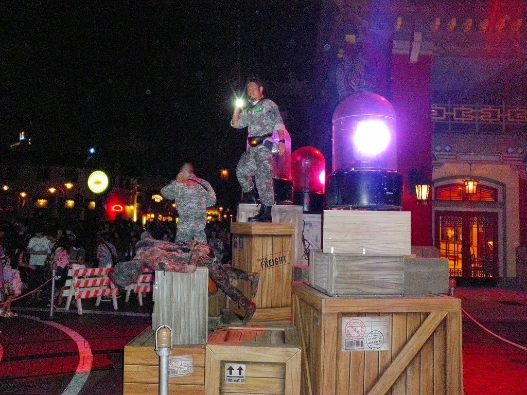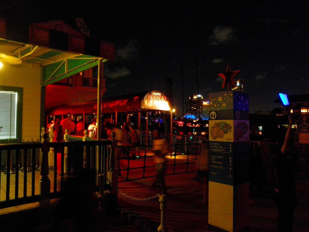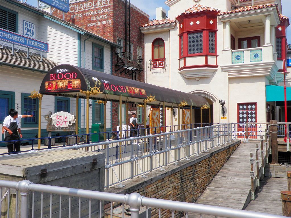 夏の楽しい宴を行っていた頃と、秋のホラー最前線の様変わり・・・ どっちも、人気のイベント開催場所は「サンフランシスコ・エリア」にあるレストラン施設 「ロンバーズ・ランディング」 昼間なのでまだマシなのですが、夜になったらこの周りは一変し ヒィー(>ω<ノ)ノ 今年は、各エリア「遊撃隊」の精鋭がアレコレ五月蝿く注意喚起し、笛を吹いたり小銃持ってゾンビを追いかけるんですが、逆に急に近寄ってこられたり近くで笛を吹きまくる方が怖いって q(*`ε´*)p