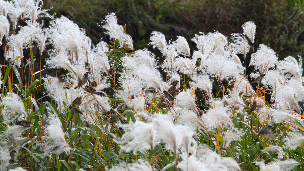 ススキに雀たちがとまっていますね^^