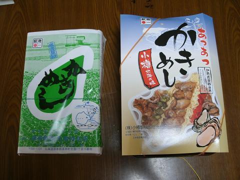 厚岸の牡蠣飯は昔ながらの駅弁で、小樽の方はヒモを引いて暖めるタイプ