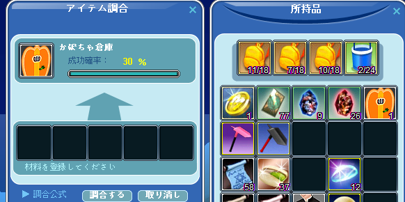 ダメモトで挑戦した「かぼちゃ倉庫」は一発で調合成功しました。