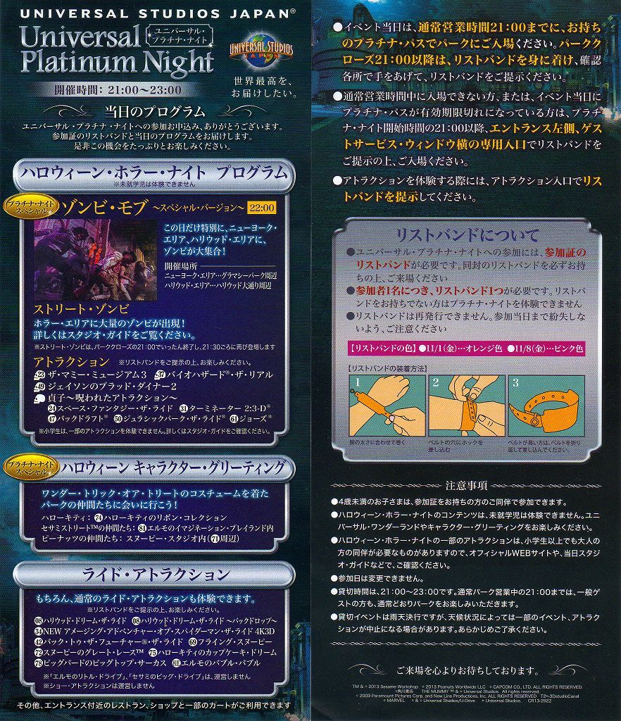 っていっても、応募すればほぼ確定だった訳ですが、昨年累計1億達成イベントだった「プラチナ・ナイト」やっつけ的なドタバタ急設定な感も否めない開催だしね・・・ とはいえ、やってくれるってんなら参加しない手は無いでしょうと応募した訳です(≧▽≦)ゞ 当日は、パーク閉園21時迄は一般ゲスト同様で21時~23時の間は各「ホラーナイト」「ワンダーランド」等の一部ショー関係を除くアトラクションを、贈られてきた参加証のリストバンドを見せて居座り楽しんできますねぇぇ Ψ( ̄∀ ̄)Ψ