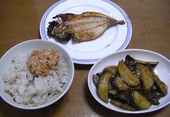 アジの開き・なすのみぞれ炒め・納豆・十穀米です