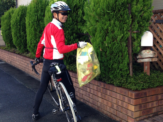 あとちょっとのトコでゴミ出しの時間に遅れてしまい自転車で回収車を追いかけるカイロです