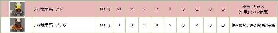 このブックで調合できる アタマ競走馬グレーは 材料を使う割りにあまり属性がよくない。。。