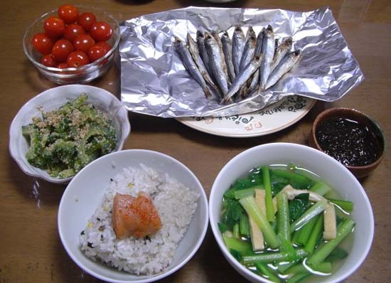 めざし・小松菜の煮びたし・ゴーヤのおひたし・もずく酢・プチトマトでした