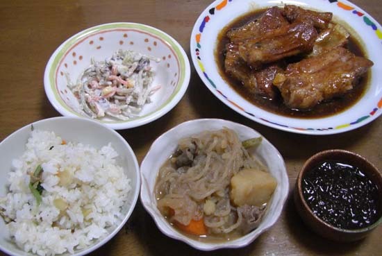 スペアリブ・肉じゃが・ごぼうサラダ・もずく酢・菜の花ご飯でした