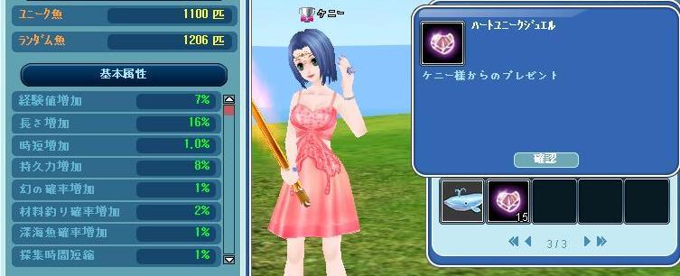 ユニーク魚釣り上げ数が1100に到達しユニークジュエルが15個飛んできました。