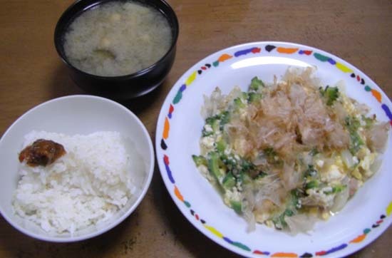 生協でゴーヤが来たので、ゴーヤチャンプル・なすとオクラと油揚げの味噌汁・大葉味噌のせご飯