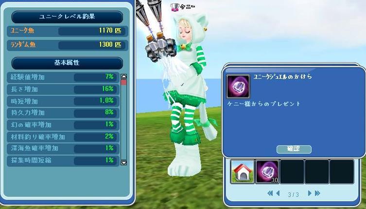 ランダム1300匹目を釣り上げユニークジュエルのかけらが30個飛んできました。