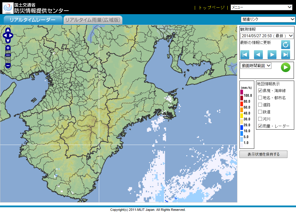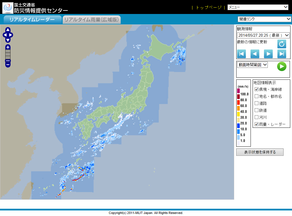 台風のときなどは広域での雨の情報を見たいので、ここのサイトをよく使います。