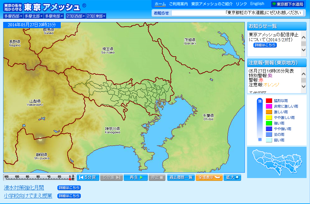 初期画面はこんな感じで、東京を中心に南関東全体の降雨量がわかるようになってます。