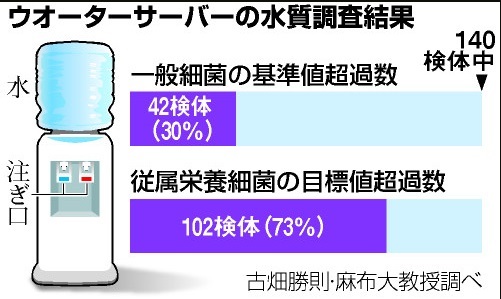 家や会社での利用者が増えているウオーターサーバー(給水器)の宅配水。麻布大学の古畑勝則教授(微生物学)が調べたところ、使用中に細菌が増殖し水道水の基準を満たさないものが数多くあるとわかった。体に影響のあるレベルではないが、「安全性確保のため、衛生管理の対策が必要だ」と話している。