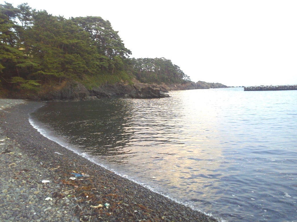 この浜辺は砂じゃなくて ちいさい石ころの浜なんです。