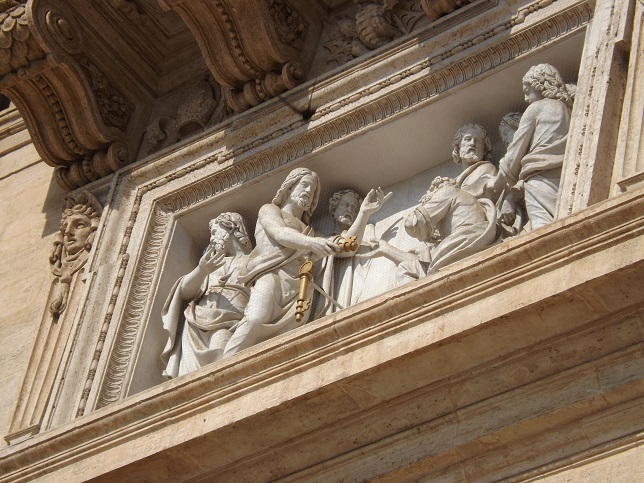 厳重な手荷物検査の後入場します。このリリーフはキリストが天の国の鍵を聖ペテロに渡している聖書の場面。聖ペテロは初代ローマ教皇なので、以来鍵はローマ法王の象徴なんだそうです~~@@