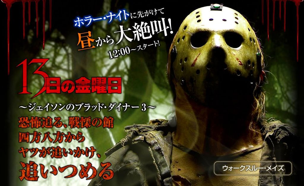 ※現在開催中の「ハロウィーン・ホラー・ナイト」開催日、「ジェイソンのブラッドダイナー3」ではゲストがジェイソンに追いかけられてます ヒィー(>ω<ノ)ノ