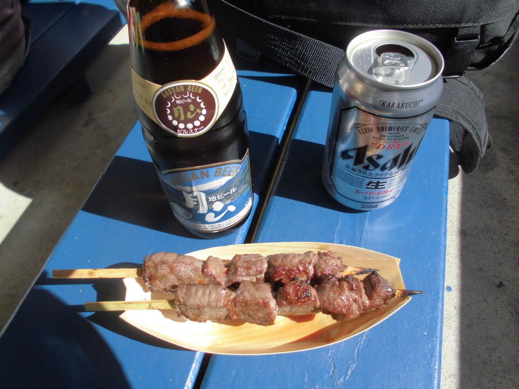 朝一から米沢牛の串と山形のビール(その前にAsahiとタコ焼き)