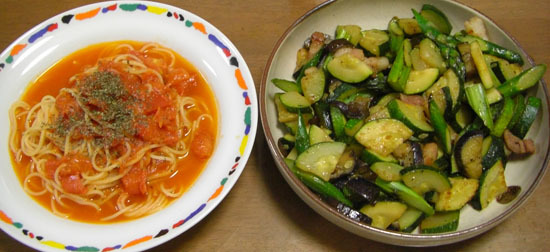 フレッシュトマトのパスタと、ズッキーニ・アスパラ・ナス・ベーコンのソテーです