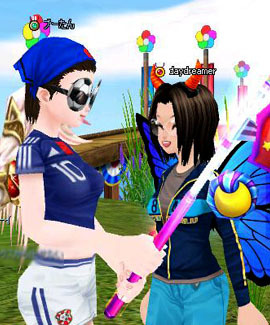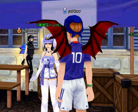 狙っているのは前衛的衣装のおねえさんか、日本代表コスプレのシンコ君か、はたまたその両方か…。