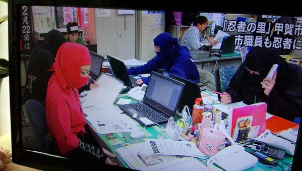 この日は職員5人が、頭巾で顔を覆った黒や赤、青などの忍者姿でパソコンに向かい、来庁者にも対応。古谷淳子室長は「忍者をPRし、市を盛り上げたい」と話していた。