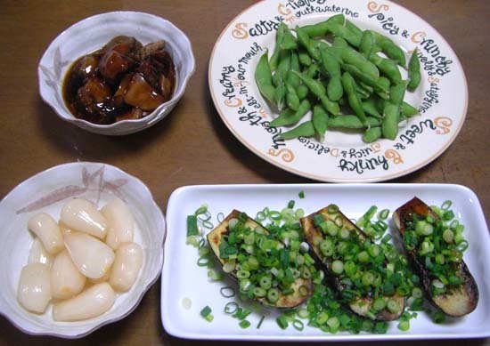 焼いたナスのネギのせポン酢・枝豆・生協の鶏肝のうま煮・自家製らっきょでした
